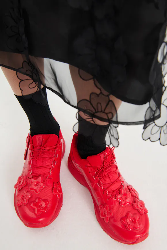 Working with the Gel-Terrain model, the trainer lays on the GT 2000 8 base, providing stability and support while maintaining a lightweight feel. The construction features a ripstop mesh upper, with padded 3D flowers scattered across the shoe’s surface. A glossy finish contrasts the delicacy of signature florals, while a monochromatic colour palette creates a sleek, elevated feeling. The lacing system uses a technical speed lacing construction, made ultra-feminine through a bespoke, floral puller piece. Debuted on Bahnsen’s Fall Winter 2024 runway show at Paris Fashion Week, the latest launch offers her signature feminine interpretation of ASICS’ Gel-Terrain sneakers, presented in three colorways.